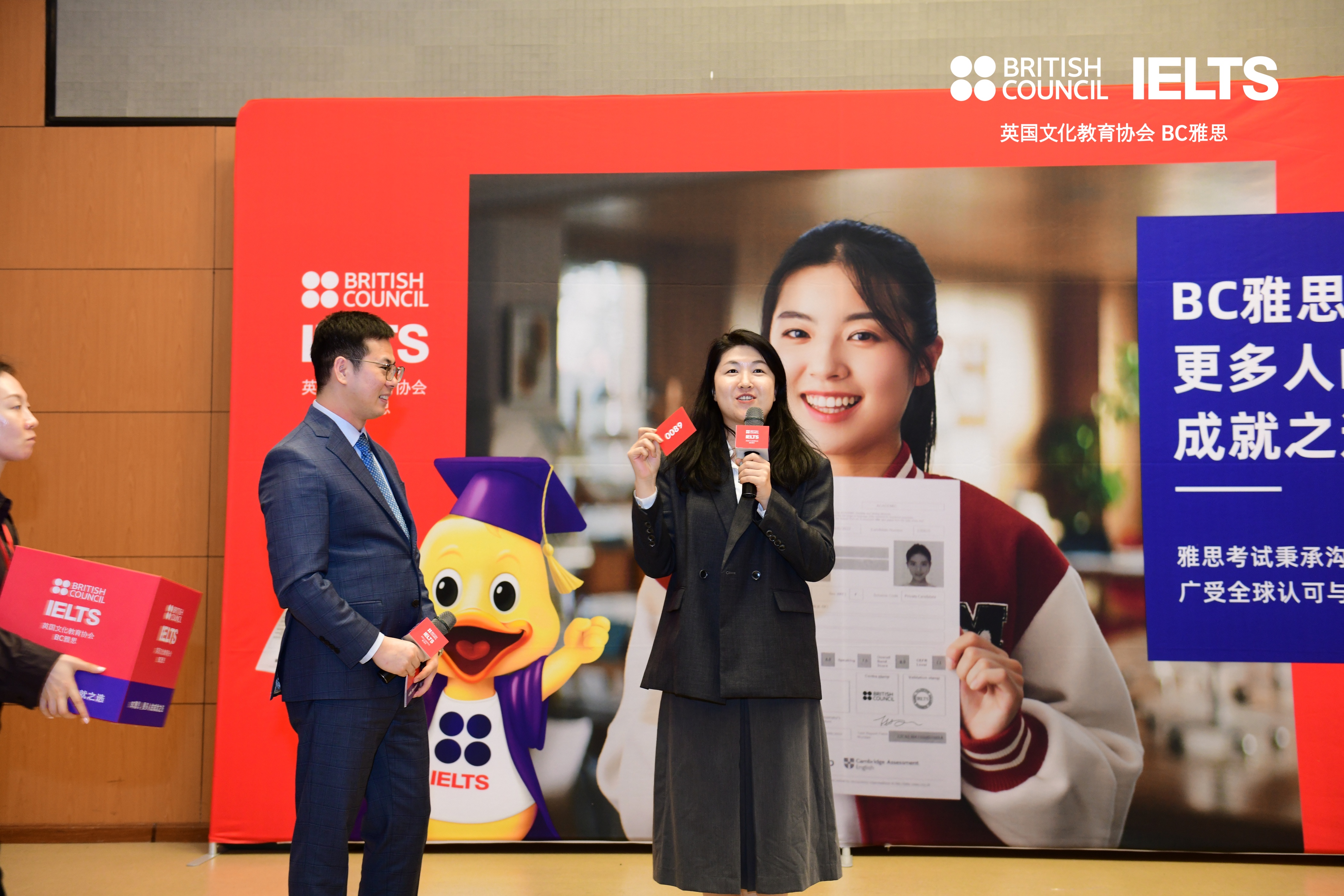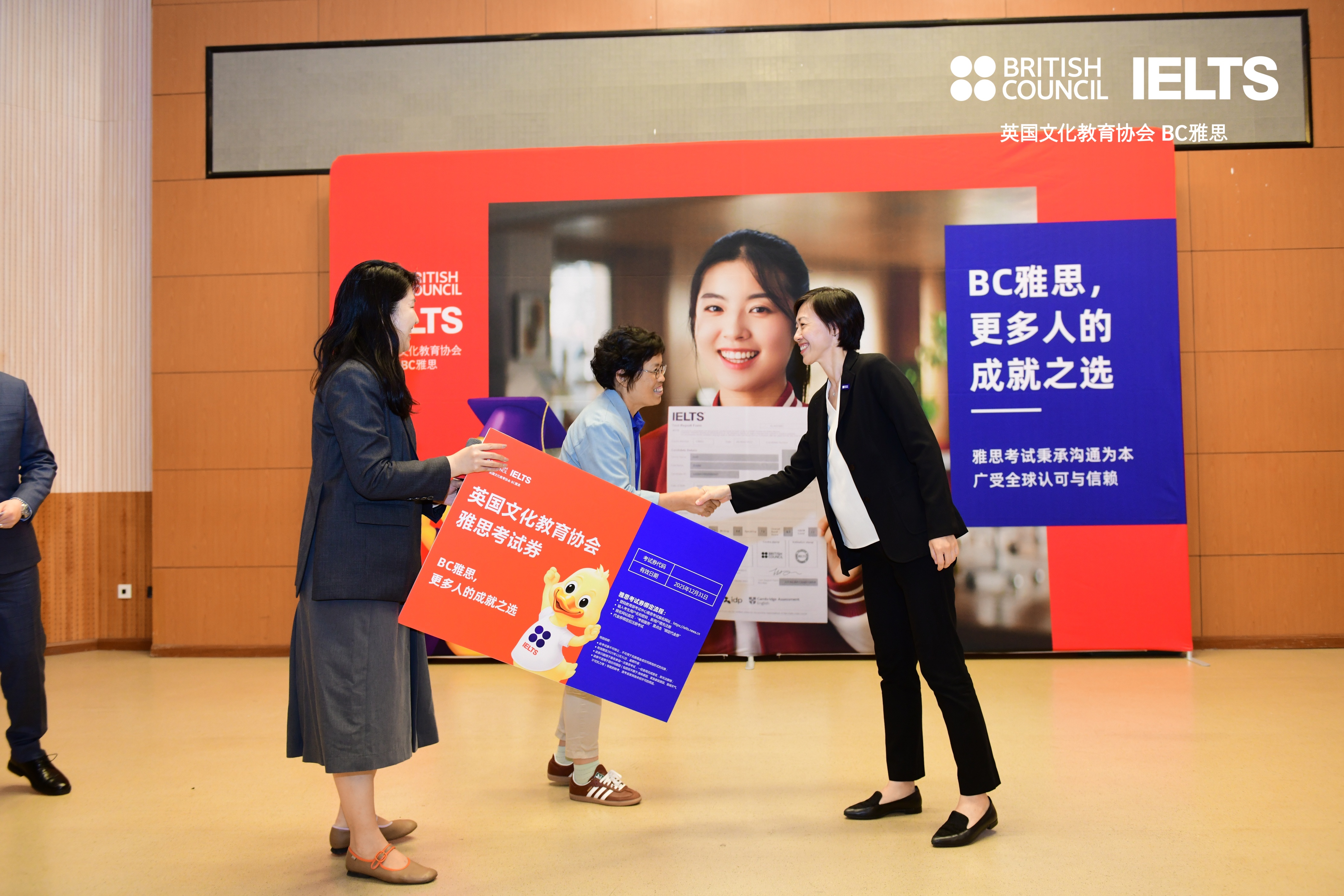 活动现场,同学们就雅思报考流程、备考资源获取、考场注意事项、海外院校申请等问题与分享嘉宾进行了互动交流。活动最后特别设置了抽奖环节,英国文化教育协会中国考试部市场总监肖彧与北外国际总经理助理兼国际教育事业部总经理马天骁为获奖同学颁发了价值2170元的雅思考试券。