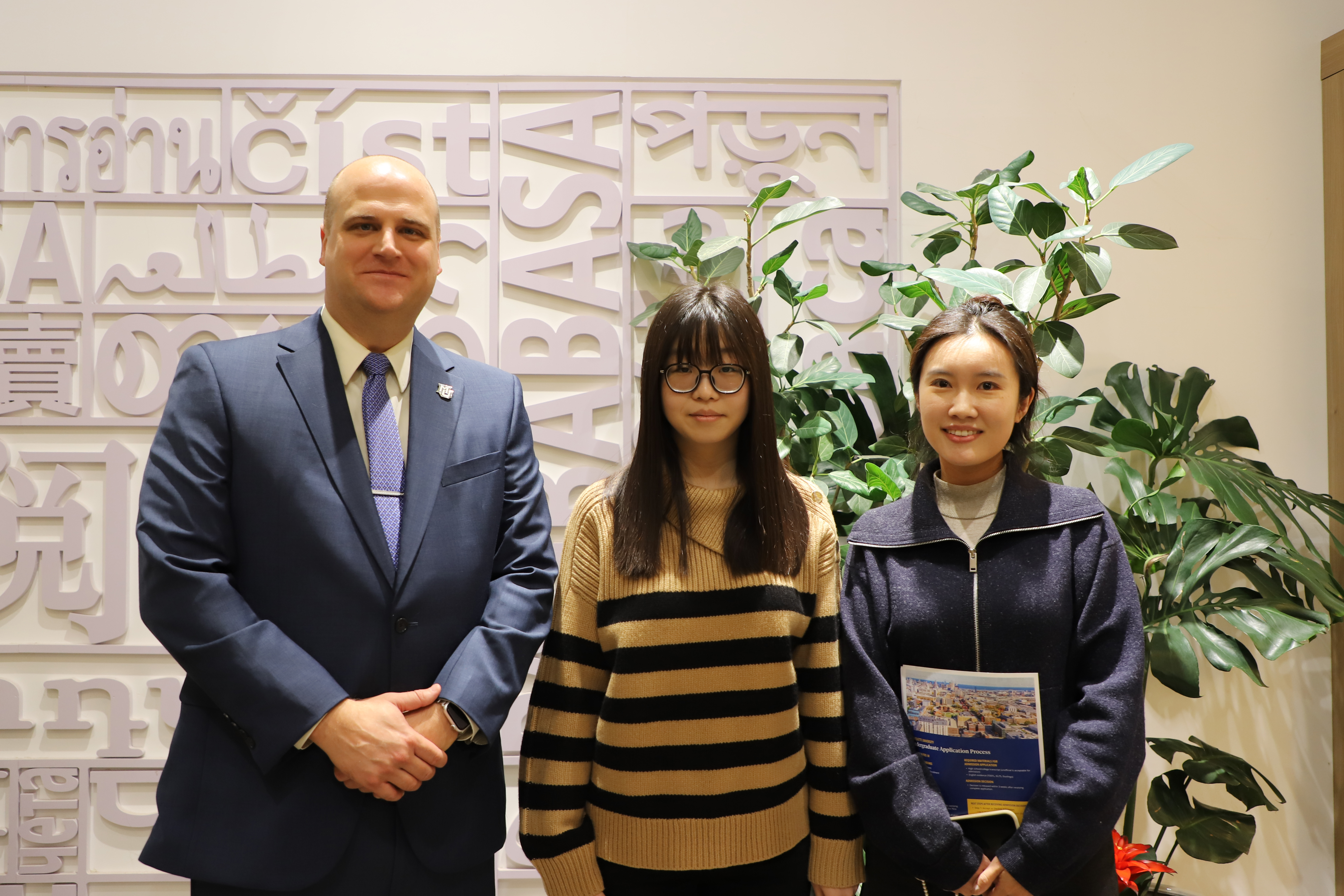 北外国际课程中心升学指导老师刘明月、学生代表陈晓宇与特罗耶副校长合影留念